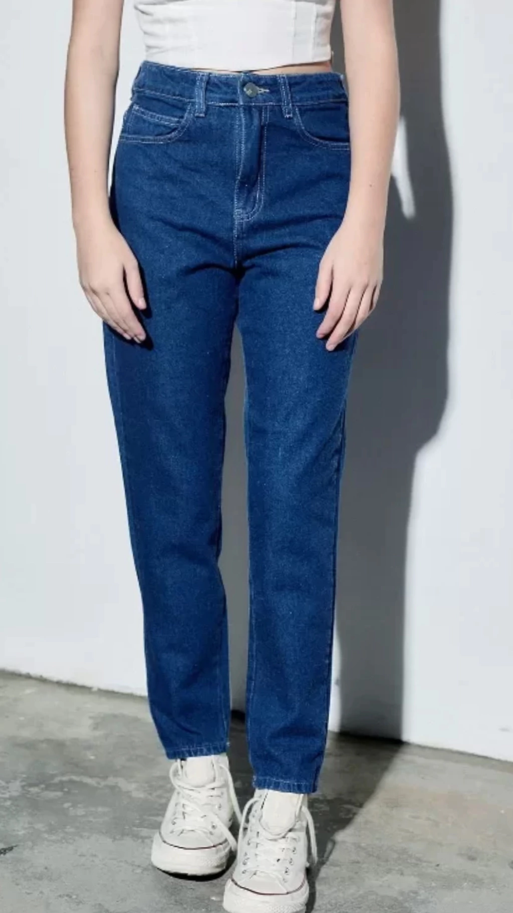 Jean mom azul, tiro alto. Confeccionado en denim rígido, algodón 100%